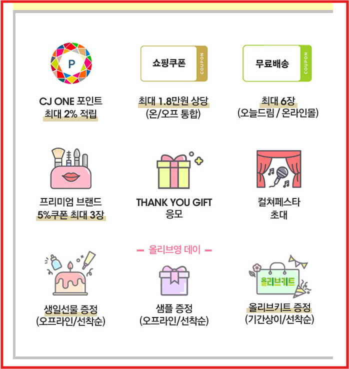 - 타임세일: 특정 시간대에 추가 할인이 적용되는 올리브영 타임세일 이벤트가 진행됩니다.