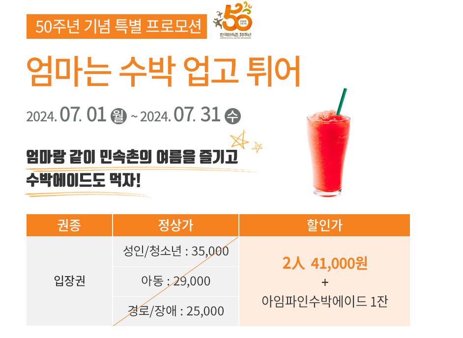 한국민속촌은 여름 축제뿐만 아니라 다양한 전통 문화 체험과 역사적 명소들을 둘러볼 수 있는 곳입니다. 축제 기간 동안 다양한 공연과 이벤트가 함께 진행되어 방문객들에게 더욱 풍성한 경험을 제공합니다. 가족, 친구, 연인과 함께 방문하기 좋은 장소로, 하루 종일 다양한 활동을 즐길 수 있습니다.