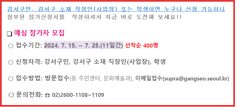 - 온라인 신청: 강서구청 공식 웹사이트에서 참가 신청서를 다운로드하여 작성 후, 이메일로 제출합니다.
