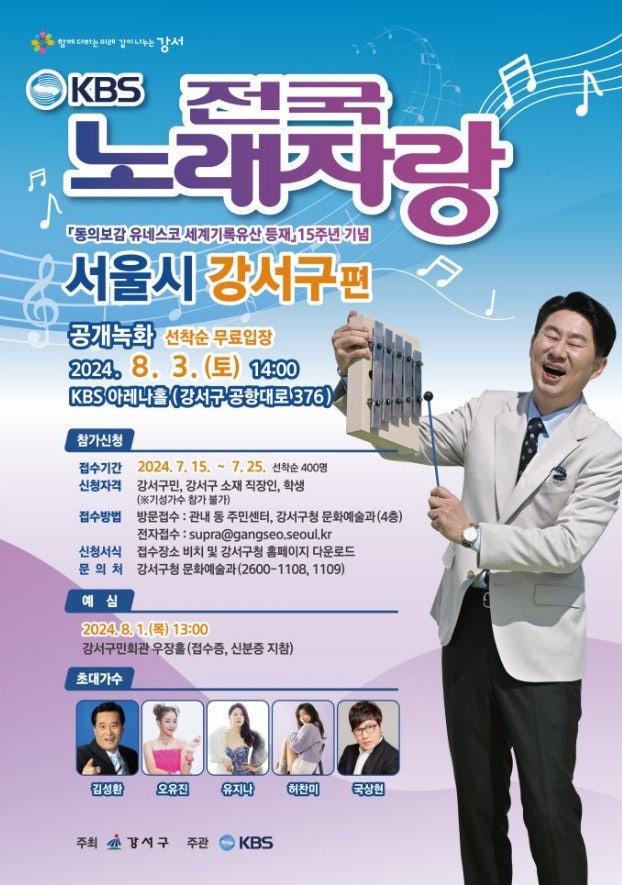 이번 전국노래자랑 강서구편은 지역 주민들이 한자리에 모여 즐거운 시간을 보낼 수 있는 좋은 기회입니다. 많은 참여와 관람을 통해 강서구의 끼와 재능을 마음껏 즐겨보세요!