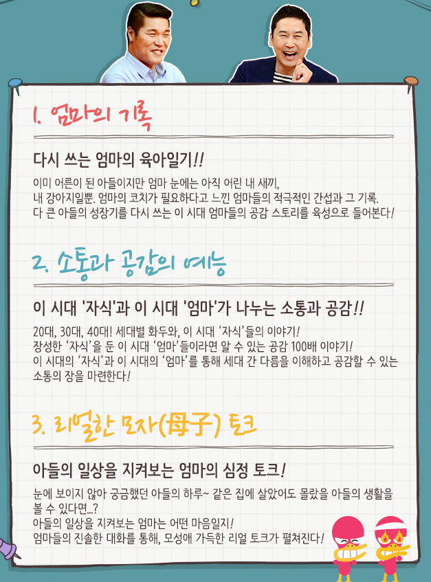 - 부모와 자녀의 일상: 출연자들이 자신의 자녀와 함께하는 소중한 순간들을 공유하며, 육아의 기쁨과 어려움을 솔직하게 이야기합니다.
