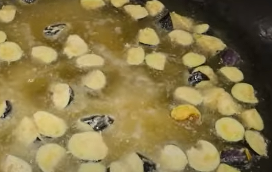 5.가지 튀기기: 준비된 가지에 튀김 반죽을 골고루 묻힌 뒤 바삭하게 튀깁니다. 가지가 노릇노릇하게 익으면 건져내어 기름종이에 올려 준비해 둡니다.