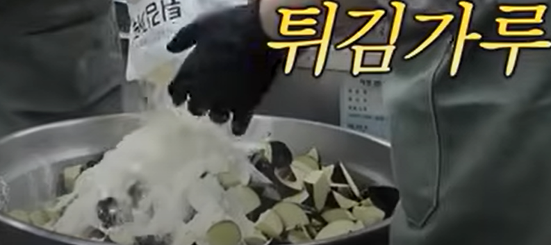 3.튀김 반죽: 튀김가루와 물을 1:1 비율로 섞어 튀김옷을 입힌니다.