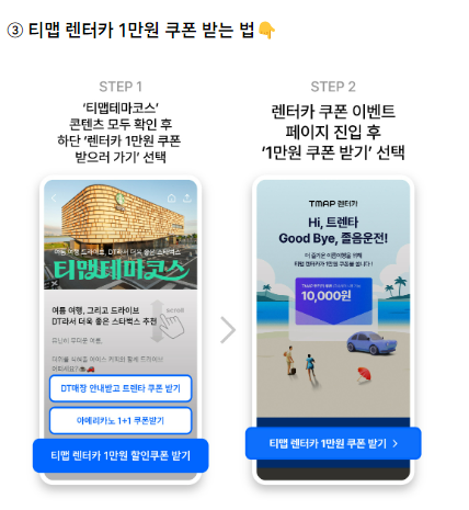 이번 이벤트에서는 트렌타 할인 쿠폰 외에도 다양한 혜택이 준비되어 있습니다. '아메리카노 1+1' 쿠폰, '티맵 렌터카 1만원 할인 쿠폰' 등도 함께 제공됩니다. 모든 쿠폰은 매일 오전 10시부터 선착순으로 발급되며, 사용 기간은 8월 31일까지입니다.