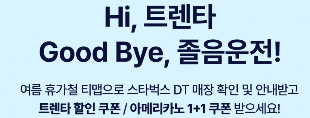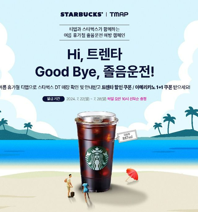여름 휴가철을 맞아 티맵모빌리티와 스타벅스가 함께 진행하는 이번 이벤트는 졸음 운전 예방과 안전한 운전을 돕기 위한 좋은 기회입니다. 티맵을 이용하는 모든 운전자들이 혜택을 놓치지 않고, 안전하게 여름 휴가를 즐길 수 있기를 바랍니다.