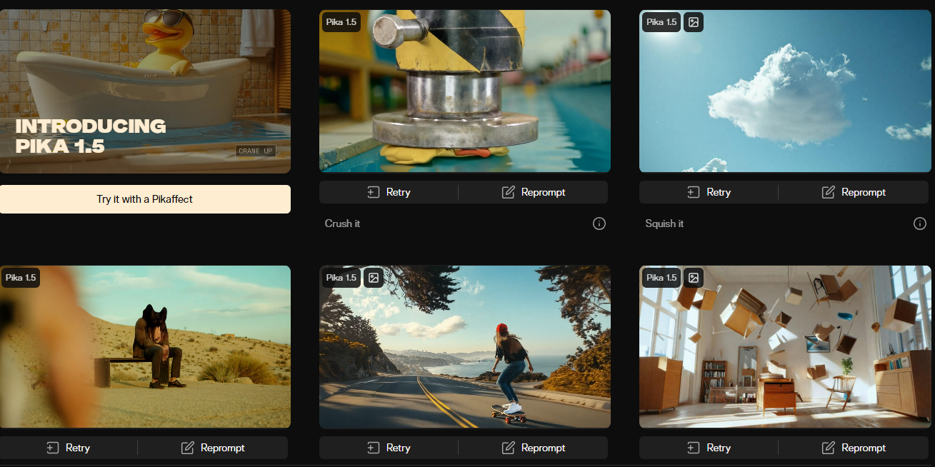 PIKA.ART의 동영상 제작은 매우 직관적입니다. 메인 화면의 프롬프트 입력창에 원하는 내용을 입력하면 AI가 이를 바탕으로 동영상을 생성합니다. 예를 들어, 특정 주제나 장면에 대한 설명을 입력하면 그에 맞는 영상을 자동으로 생성해 줍니다. 이는 콘텐츠 제작 초보자도 쉽게 동영상을 제작할 수 있도록 해줍니다.