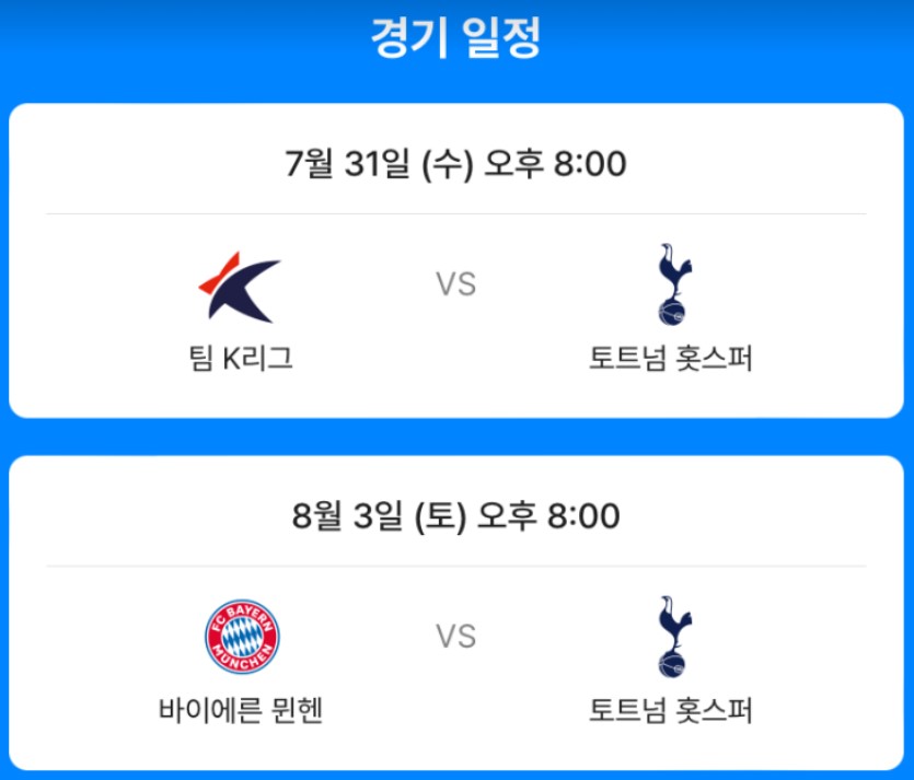 토트넘 vs 뮌헨 / 토트넘 vs 팀 K리그 경기 일정