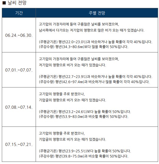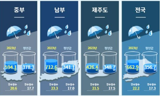 - 남부 지방: 6월 23일 (평균 강수량 341.1㎜)