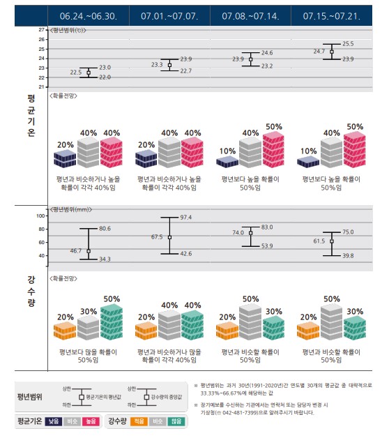 북태평양 고기압이 확장되면서 우리나라로 이동하며 많은 비를 동반하게 됩니다. 우리나라의 평년 장마 시기는 제주도는 6월 19일(평균 강수량 348.7㎜), 남부 지방은 6월 23일(341.1㎜), 중부 지방은 6월 25일(378.3㎜)입니다.