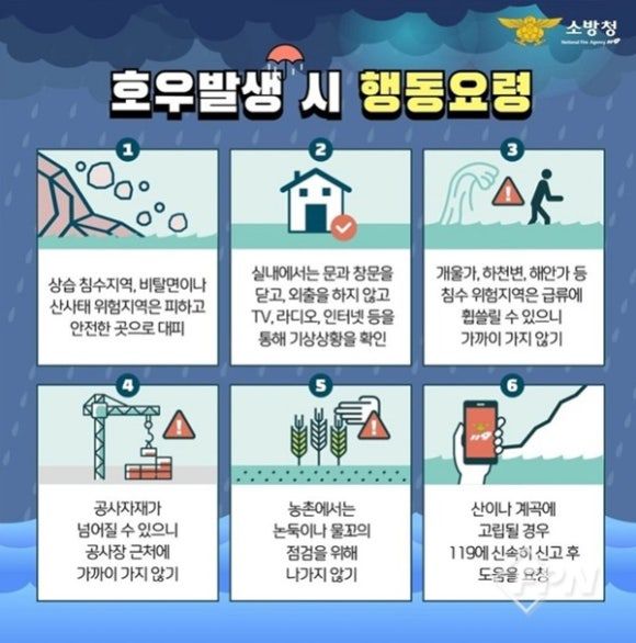 침수 지역 피하기: 침수된 도로나 다리는 피하고, 물에 잠긴 도로를 건너지 않도록 주의하세요.