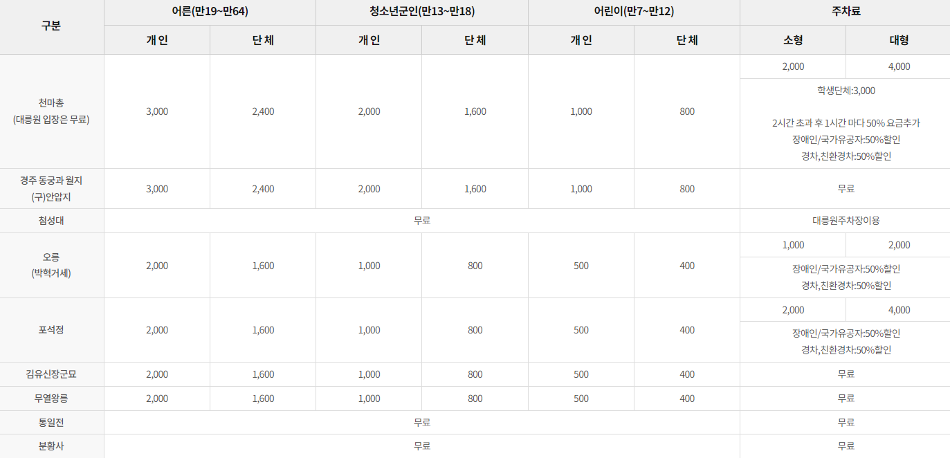 대릉원은 신라 시대의 거대한 고분군으로, 천마총을 비롯한 여러 고분들이 있습니다. 내부에 전시된 다양한 유물을 통해 신라 왕족의 생활과 문화를 엿볼 수 있습니다.  무료(천마총은 제외)